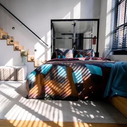 Dekbedovertrek Pema is gemaakt van 100% schone biologische katoen-satijn en heeft een prachtig uniek dessin. Op een diepe donkere ondergrond ligt een dessin met abstracte