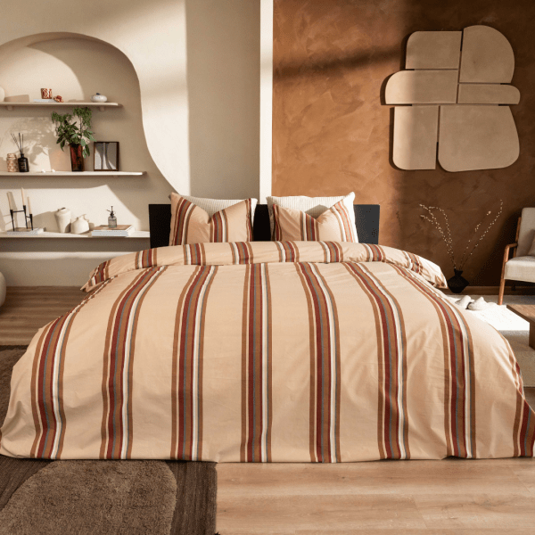 Dekbedovertrek Agui is een Yarn Dyed dessin. Dit betekent dat de garens worden geverfd alvorens het weven. Hierdoor is het dessin voller van kleur en blijft de kleur extra lang mooi! Het dessin krijgt diepte door de gekleurde garens en heeft een unieke strakke streep met funky kleurtjes.