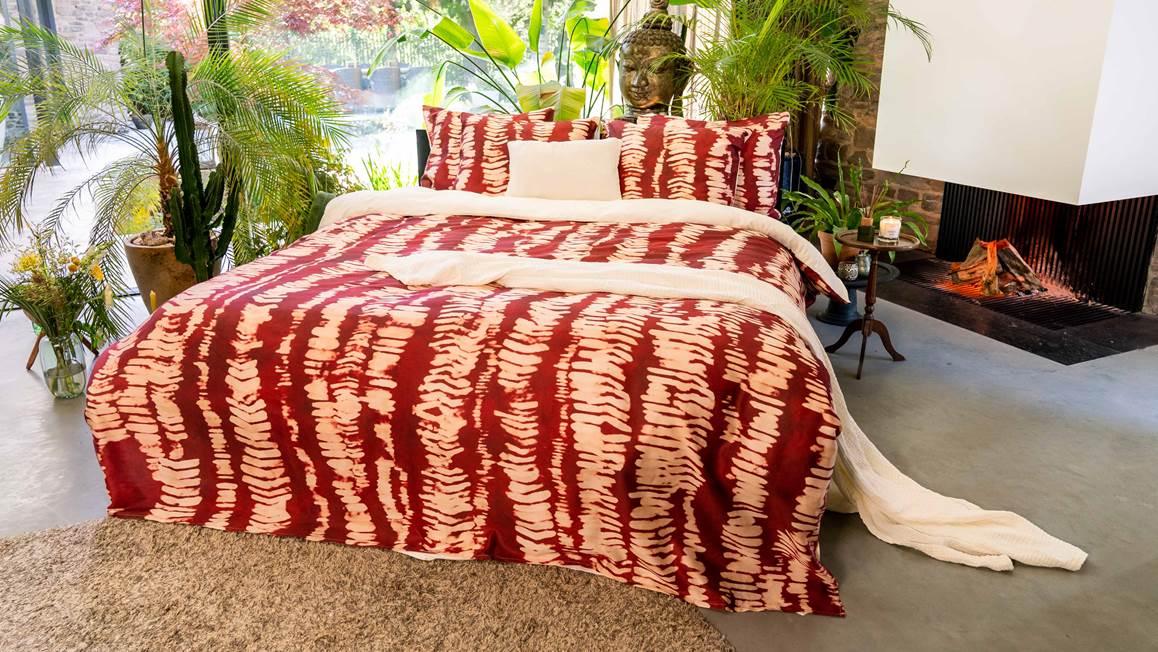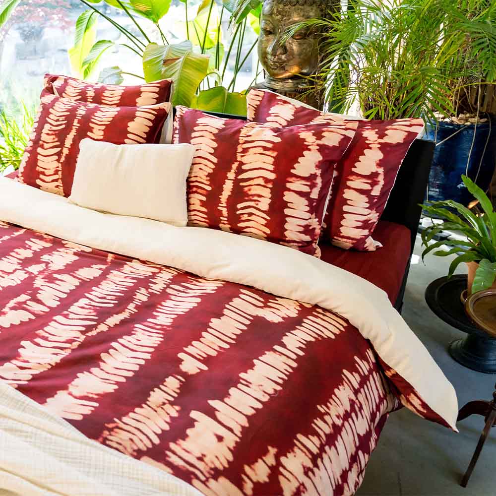 Chikuma doet denken aan de verftechniek tie-dye maar dan in een geheel nieuwe uitvoering. De crème kleurige organische vormen liggen in rechte lijnen op de granaatappel rode ondergrond. De combinatie van zachte, ronde vormen in rechte banen zorgt voor een geordend maar toch speels dessin. De achterzijde van dit dekbedovertrek is crèmekleurig. Dekbedovertrek Chikuma is gemaakt van 100% schone biologische katoen satijn: super zacht, luxe glans én comfortabel door het ademende karakter van katoen. De achterzijde van het overtrek is effen donkerrood.