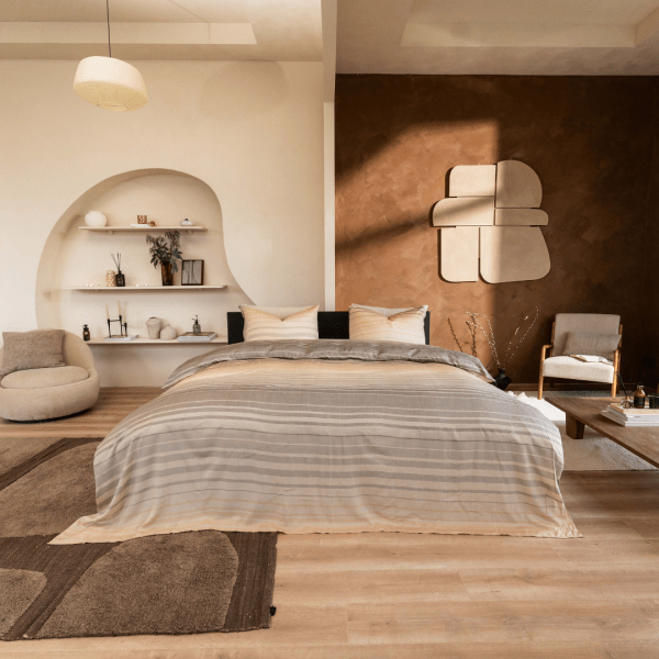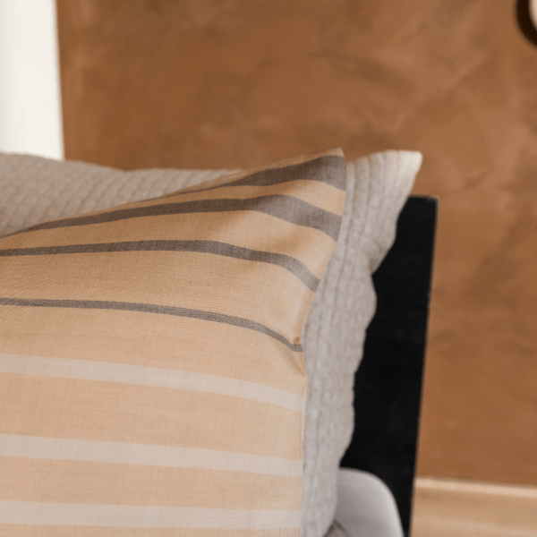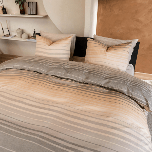 Dekbedovertrek Hibara heeft absoluut een uniek dessin! Met breedte strepen die niet alleen in breedte maar ook in kleur opbouwt over het gehele dekbedovertrek. Door het gebruik van neutrale kleuren zoals zand en lichtgrijs, krijgt het overtrek een rustige en serene uitstraling. Wat ook bijzonder is aan dit overtrek is dat hij Yarn Dyed is. Dit betekent dat de garen van te voren zijn geverfd en daarna in elkaar zijn geweven. De print is er dus niet achteraf op geverfd maar zit er echt in verweven!