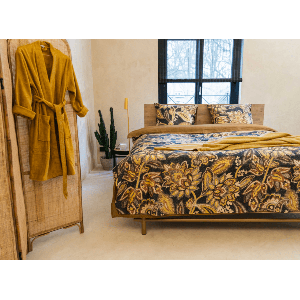 Het dessin ‘Isao’ is een herkenbaar dessin in een nieuw jasje. Bekende elementen uit mandala’s en paisley’s zijn uitgewerkt in prachtige goud-tinten op een diep donker bruine achtergrond. De achterzijde van het overtrek is uni effen goud. De stof van dit dekbedovertrek is de krachtige maar soepele pima-katoen. Een katoen soort die bijzonder sterk, slijtvast en zacht aanvoelt. Hierdoor blijft het overtrek heel lang mooi en voelt het heerlijk aan. Het dekbedovertrek is verpakt in een zak van de eigen stof: zo krijg je meteen een voorproefje van het dekbedovertrek!
