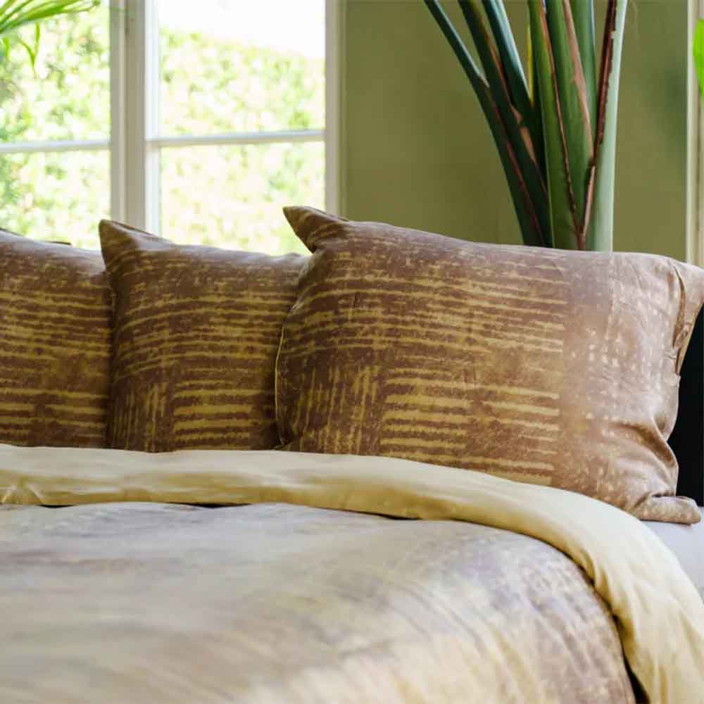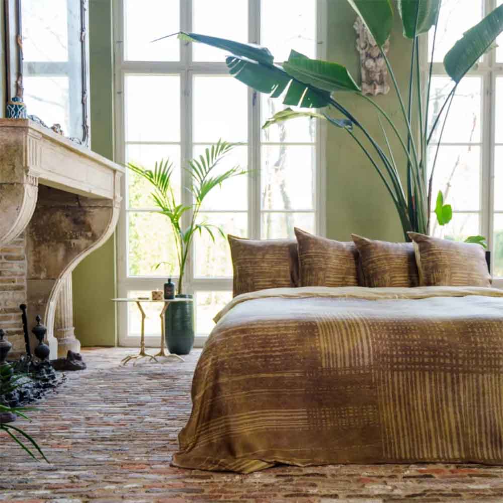 Dekbedovertrek Kumo heeft een gaaf industrieel dessin. De verticale en horizontale lijnen vormen blokken op het overtrek. Kumo heeft gele en bruine tinten die zorgen voor een warme uitstraling. De uni kleur aan de achterkant is goud.
