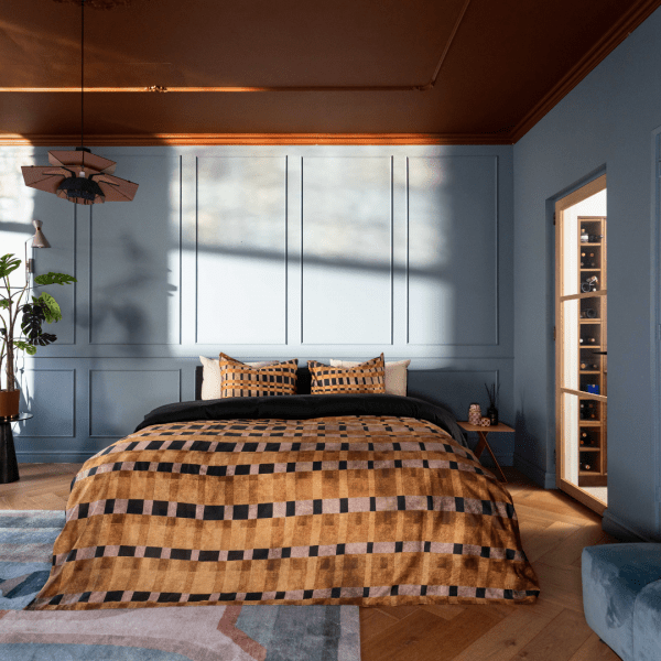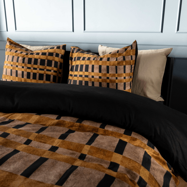 Een dekbedovertrek zoals Lide is er een die je nog niet eerder hebt gezien. Dit unieke design is een echte eyecatcher in je slaapkamer! De oneven geblokte print geeft het een speelse look en het gebruik van de prachtige gouden en zwarte kleuren versterken dit.