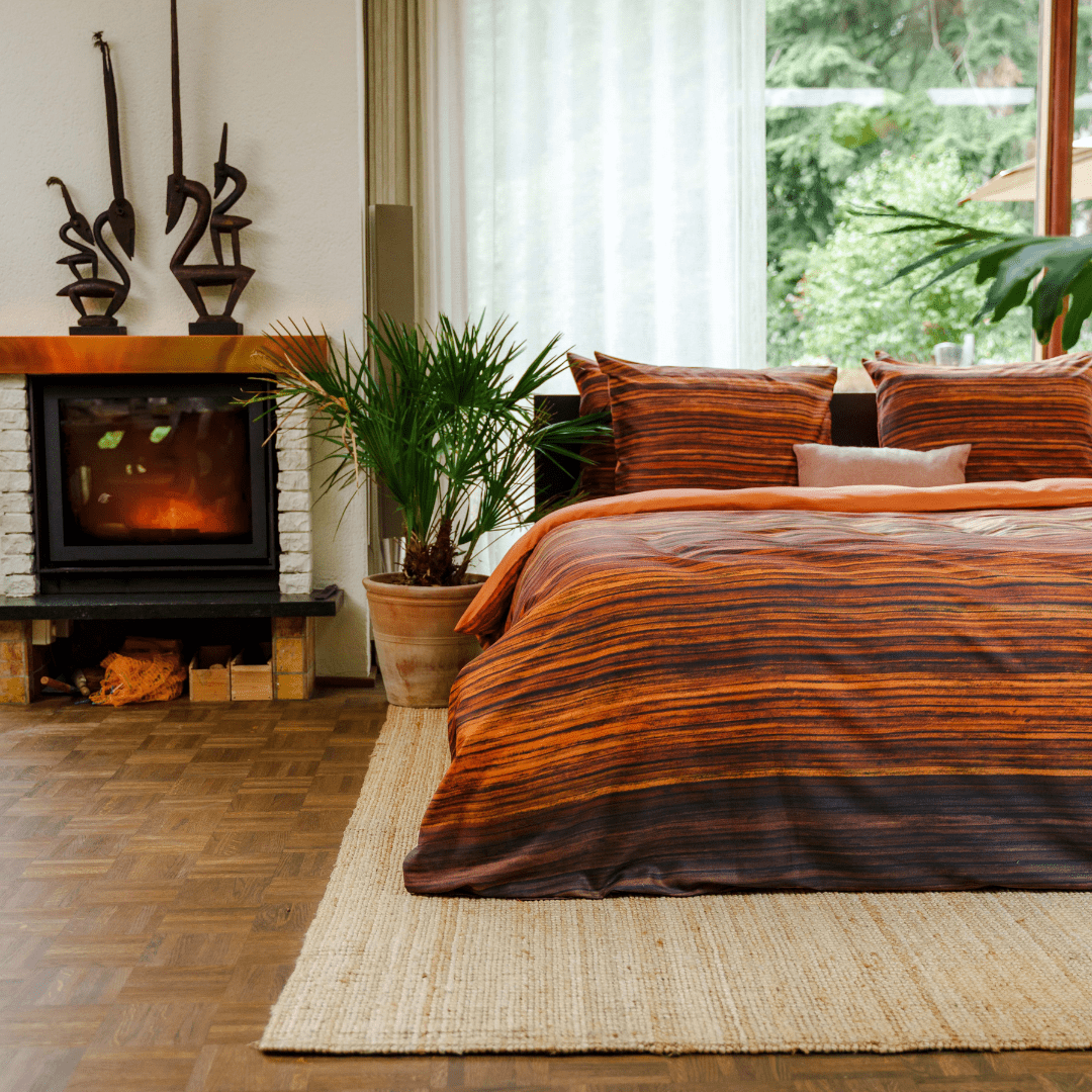 Dekbedovertrek Mosa van de Maasai lijn is geïnspireerd op het nomaden bestaan en de uitgestrekte Afrikaanse vlaktes. Het gestreepte dessin bevat mooie aardse rode en oranje tinten. Doordat de verschillende kleuren mooi in elkaar overlopen doet het bijna denken aan een zonsondergang.