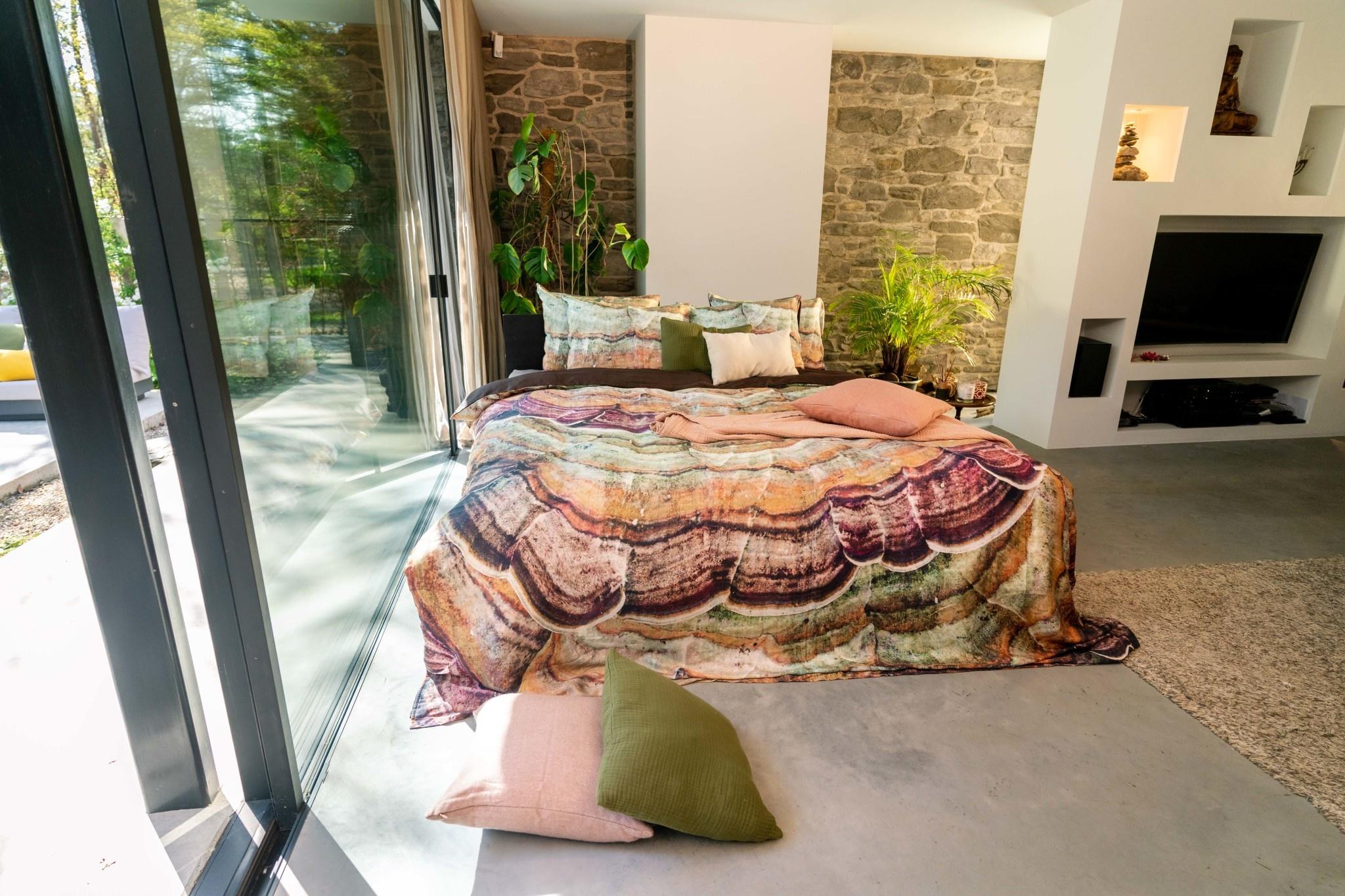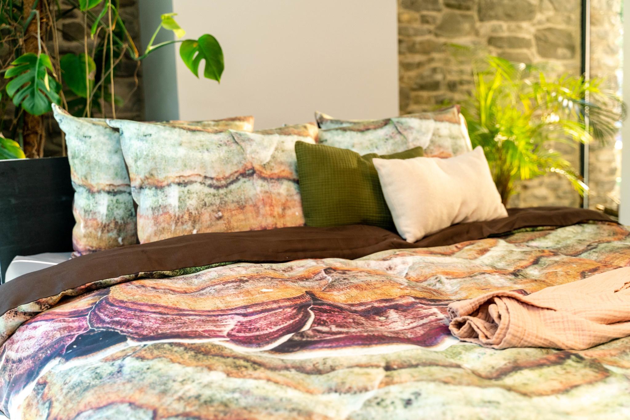 Een verrassend en veelzijdig dessin: Sasebo is een overtrek met verschillende kleuren in een gave print. De print doet denken aan gesteentes met verschillende lagen en kleuren. De kleuren in overtrek Sasebo zijn o.a. olijfgroen, beige, paars-roze en offwhite als ondergrond. Dekbedovertrek Sasebo is gemaakt van 100% Tencel, een oersterke en extreem zachte stof. De unieke eigenschappen van deze stof zijn het ventilerend vermogen (warm in de winter/ koel in de zomer) en het feit dat bacteriën geen kans krijgen bij Tencel: zo blijft de stof langdurig fris ruiken