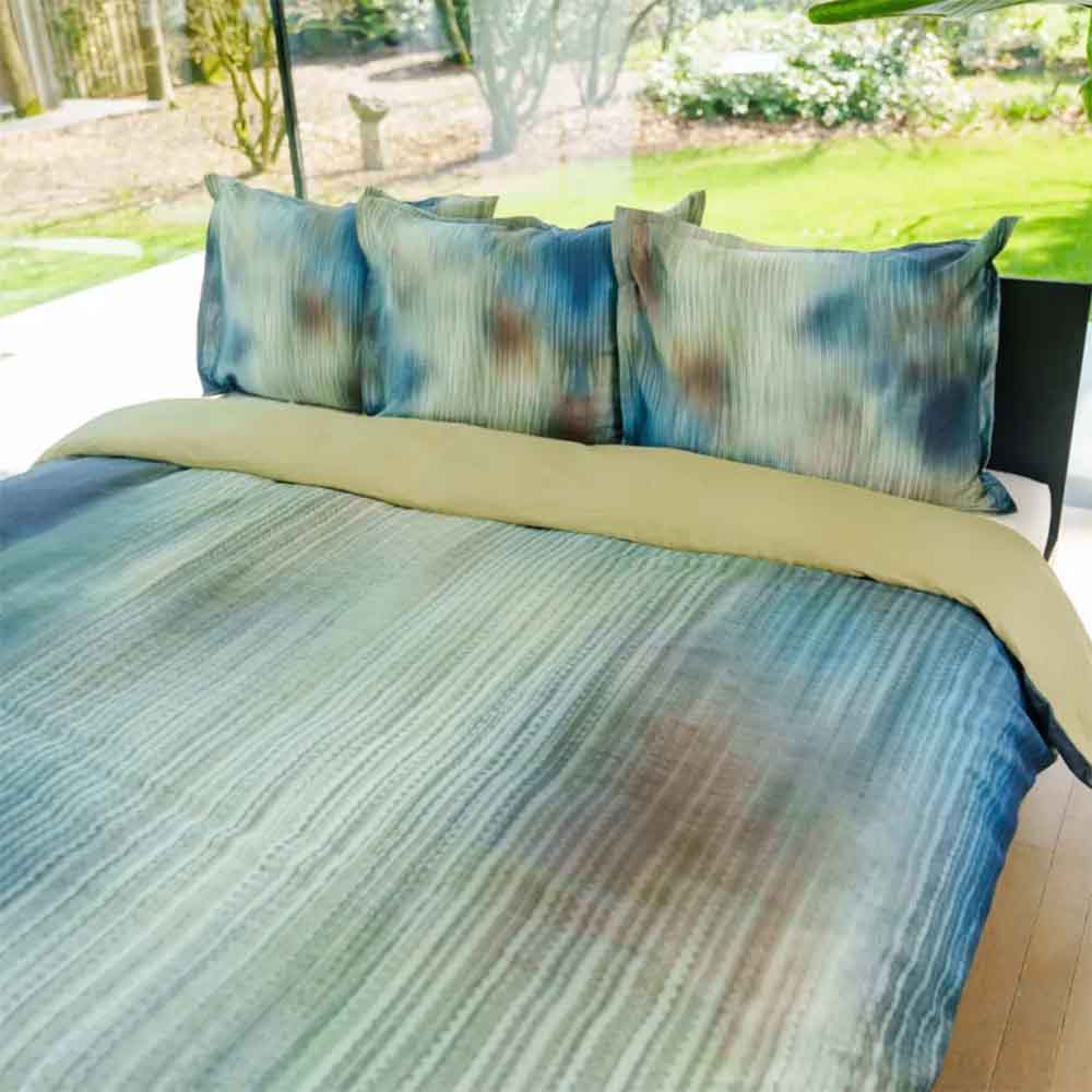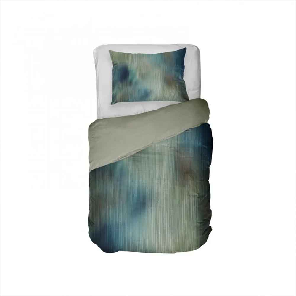 Dekbedovertrek Toka heeft een prachtige samenhang van groene en blauwe kleuren. Het dessin is gevlekt en wordt afgewisseld door verticale lijnen waardoor het totaal lichtelijk vervaagd lijkt. De uni kleur aan de achterkant van het overtrek is olijfgroen.