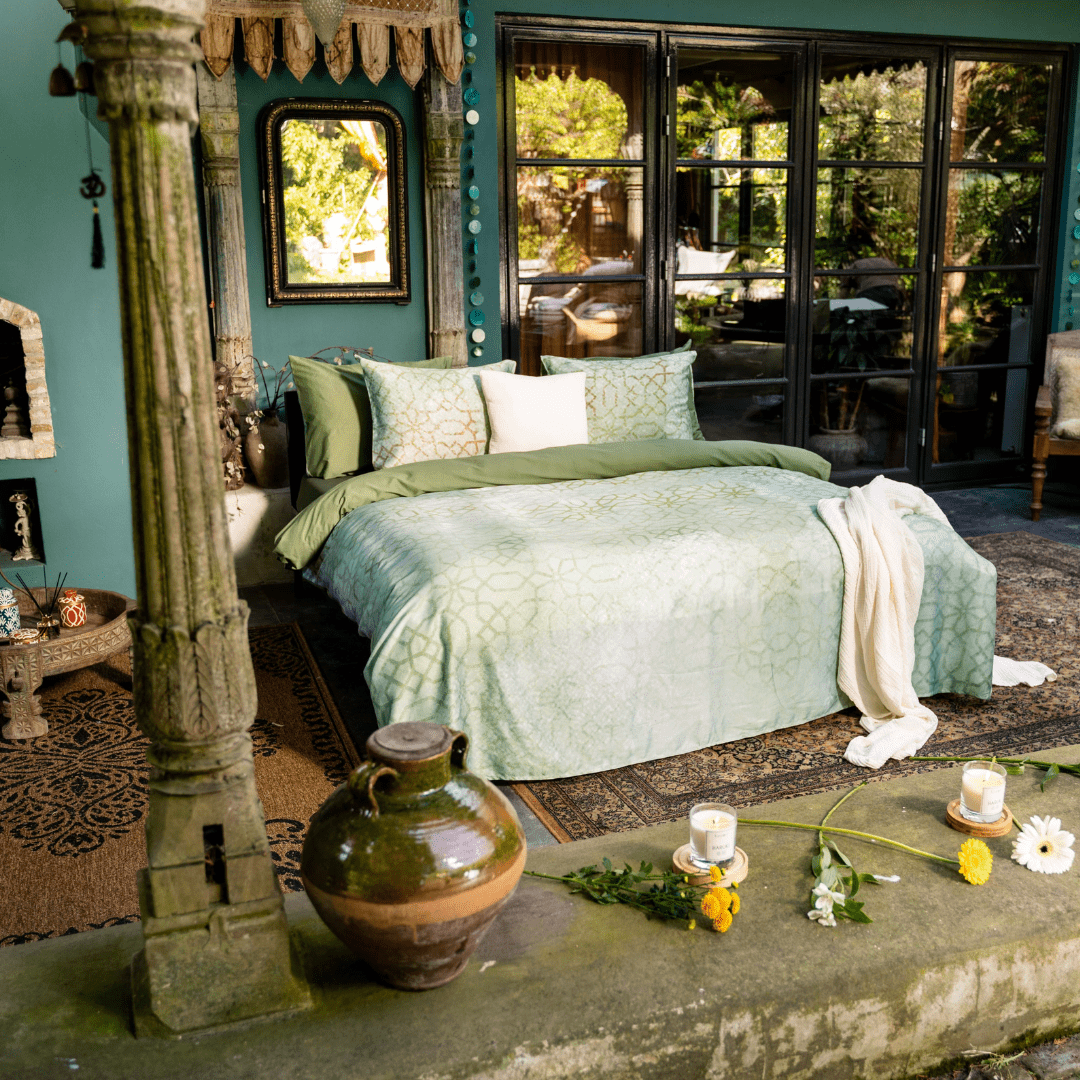 Dessin Zuru heeft een zacht groen/gele ondergrond in mooie kleurvervagingen. Hier overheen ligt een subtiel grafisch dessin, door de vervagingen lijkt je te kijken naar een eeuwenoude mozaïekvloer. Een rustgevend geheel geschikt voor elk interieur. Dit dekbedovertrek is gemaakt van 100% Egyptische katoen satijn. Hierdoor is het overtrek niet alleen oersterk maar ook heel glad en zacht. Door de gladde vezel in combinatie met de satijnbinding is dit dekbedovertrek zacht voor huid en haar. De achterzijde van het dekbedovertrek is effen groen.