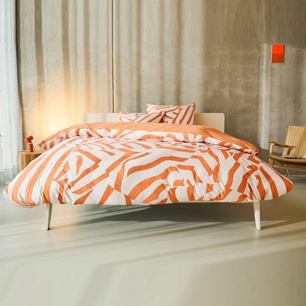 Op dit katoensatijnen overtrek komen speelse strepen terug in het abrikoos, de trendkleur van nu. Op de achtergrond staat een lichtbeige print, die bijna geweven lijkt. Zowel de achterkant van het overtrek als de kussenslopen zijn effen oranje.