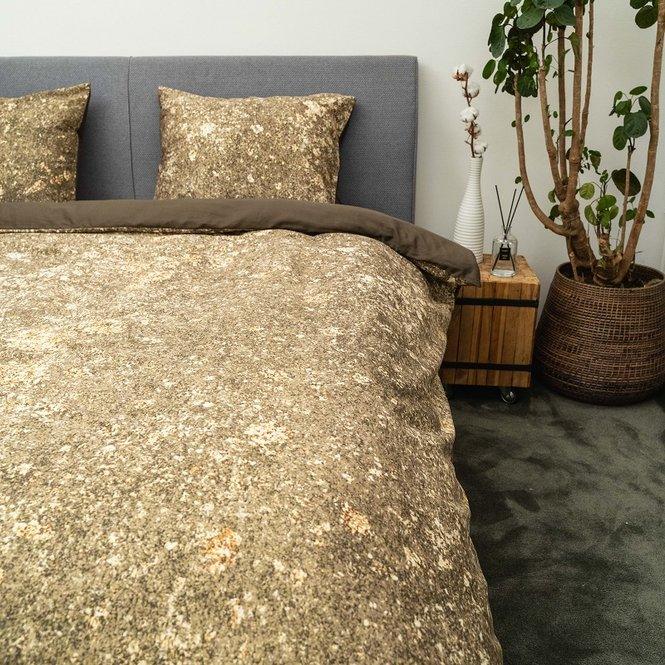 Het dessin Hiyori heeft een mysterieuze print. De ondergrond is taupe, het dessin is een feest van speelse spetters is goud. Deze gouden print heeft een prachtig goud-effect door gebruik van een subtiele glitter. Het dekbedovertrek is gemaakt van 300TC biologische katoe en voelt dus lekker zacht aan. De achterzijde van het dekbedovertrek is effen taupe. Het dekbedovertrek heeft een hoes van de eigen stof, je hebt meteen een voorproefje van het dessin!