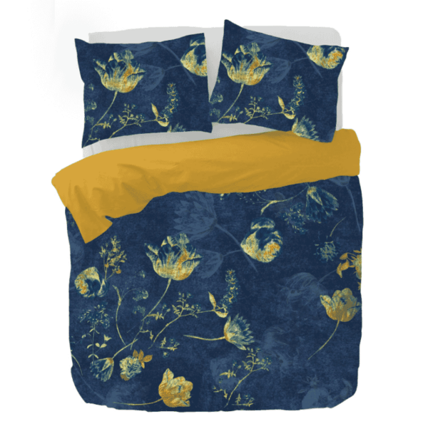 Het Lya dekbedovertrek uit de collectie van Kayori valt op door de prachtige goudkleurige bloemenprint, die op een donkerblauwe achtergrondkleur is geplaatst. Het dekbedovertrek straalt kracht en elegantie uit.
